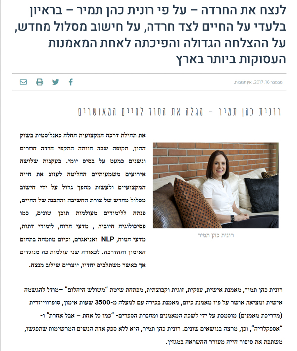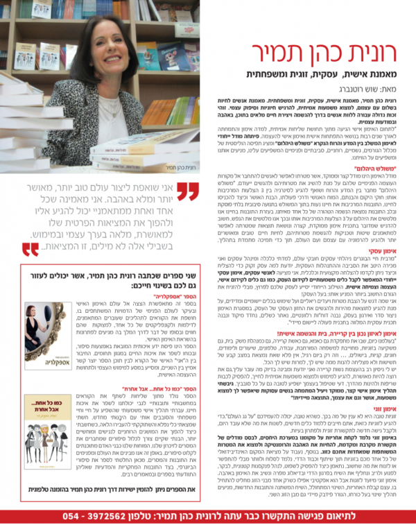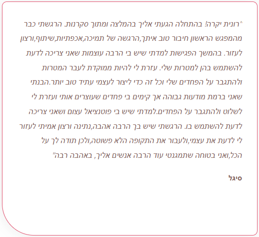 עוזרת לנשים שסובלות מחרדות, דכאון ומחשבות טורדניות, להשתחרר ממה שמעיק עליהן מבפנים, ולהשיג בטחון, שלווה ושמחה שמגיעים מבפנים, ובמקום להימנע לחזור ליהנות שוב מהחיים וכל הטוב שיש להם להציע לנו.